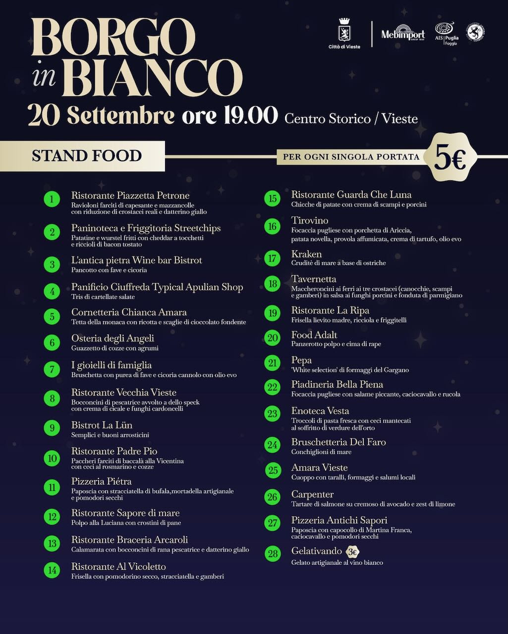 Quando la luce calda di settembre incontra il bianco delle pietre antiche, Vieste si trasforma in un salotto a cielo aperto. È in questo scenario suggestivo che prende vita “Borgo in Bianco”, l’evento che celebra l’eleganza dei vini bianchi e delle bollicine, in un connubio unico tra gusto, bellezza e convivialità.