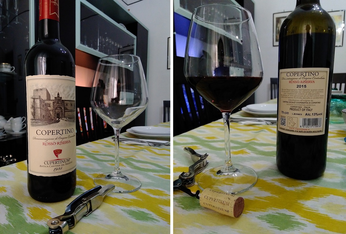 Se il secondo piatto è una brasciola alla barese, ovvero involtino di carne di cavallo al sugo e pecorino, il Copertino Rosso DOC della Cupertinum è un ottimo accompagnatore. Questo vino dal colore rubino scuro con riflessi granata e dai profumi intensi di mora e prugna e cenni di spezie dolci ha la giusta consistenza e pienezza in bocca. Tra i riconoscimenti citiamo Premio guida Pocket Wine Book di Hugh Johnson; 2 Tralci guida Vitae Associazione Italiana Sommelier; 2 Stelle guida Veronelli; 91 punti guida Luca Maroni.