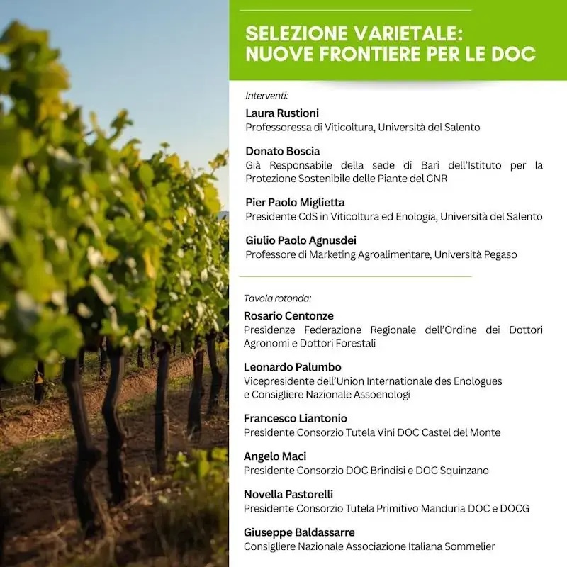 Il confronto vedrà la partecipazione di autorevoli relatori del mondo accademico e della ricerca, tra cui Laura Rustioni(Università del Salento), Donato Boscia (già responsabile CNR Bari), Pier Paolo Miglietta (Università del Salento) e Giulio Paolo Agnusdei (Università Pegaso), chiamati ad approfondire gli aspetti agronomici, scientifici ed economici legati alle nuove prospettive per le DOC.